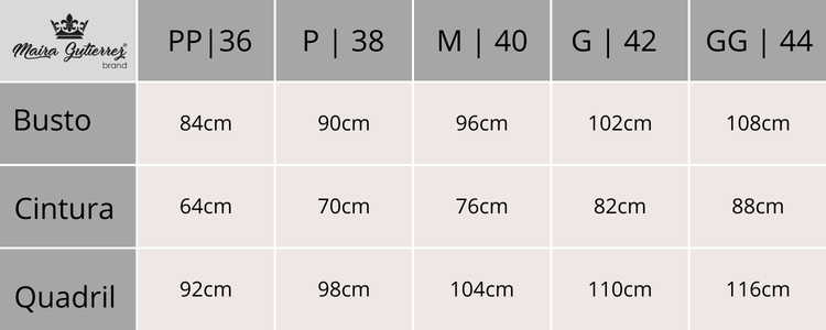Tabela de medidas da peça: